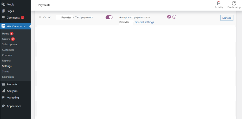 - Go to the Payments tab in the Settings subsection of the WooCommerce section.