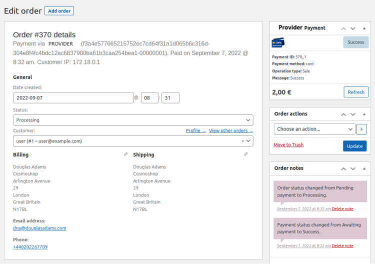 More detailed information about working with orders in the WordPress interface is provided in the WooCommerce documentation.