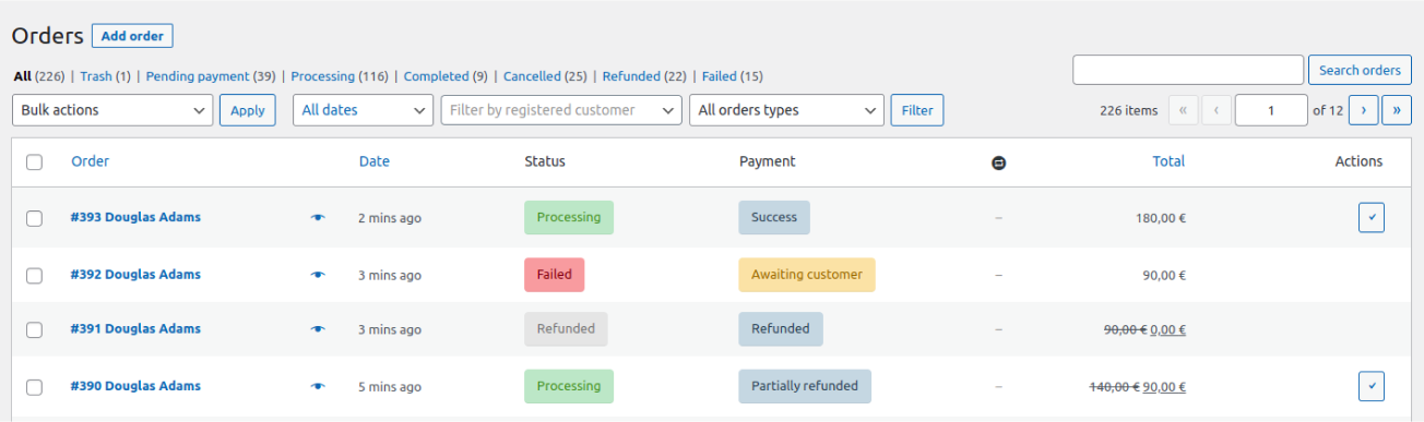 The information about payments (including series of debits as part of COF purchases) processed with the use of the Flashpay Payments plug-in and about the corresponding orders can be monitored via the WordPress interface via the tools of the Orders subsection in the WooCommerce section.