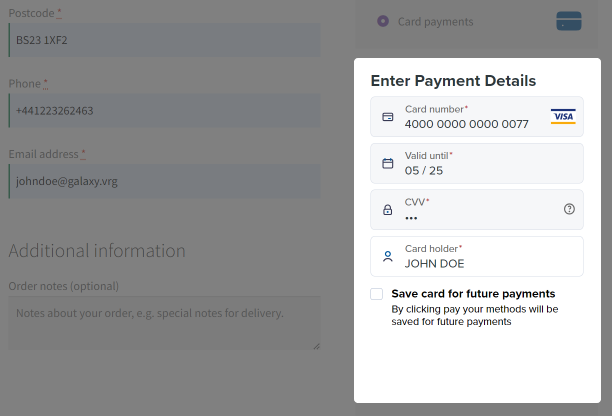 4000 0000 0000 0077—for a purchase to be processed4111 1111 1111 1111—for a purchase to be declined