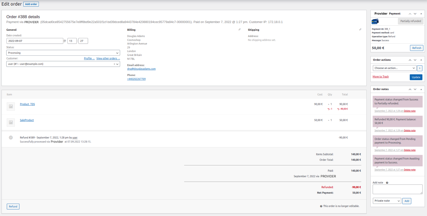 - Ensure that the order amount has changed by the refund amount and the right sidebar Order notes displays the notification about the performed operation.