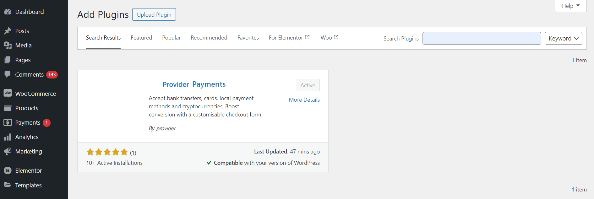 To start using the Flashpay Payments plug-in, you need to install it. Along with that, if an earlier version of this plug-in was previously used, it is recommended to deactivate this version before installing the new one (you can do it through the list of installed plug-ins in the WordPress interface). There are two ways to install the plug-in in the WordPress interface—via the plug-ins directory of WordPress (without prior download of the plug-in file) or via the plug-ins upload function in the WordPress interface (with the plug-in file downloaded beforehand). The plug-in file can be downloaded from the directory or from GitHub.