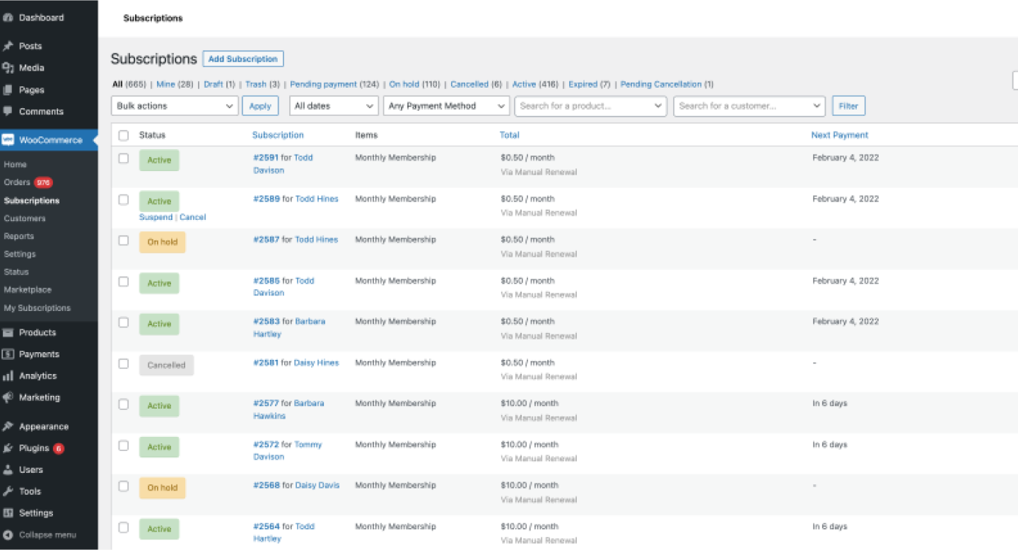 With the WooCommerce Subscriptions extension, you have the access to the Subscriptions subsection in the WooCommerce section. This subsection contains the information about COF purchases (in addition to the information displayed in the Orders subsection). Similarly to the Orders subsection, the Subscriptions subsection displays the subscriptions register with main details about every subscription and provides the capabilities of searching and filtering data as well as opening the tabs of separate subscriptions and performing various actions related to the subscriptions.