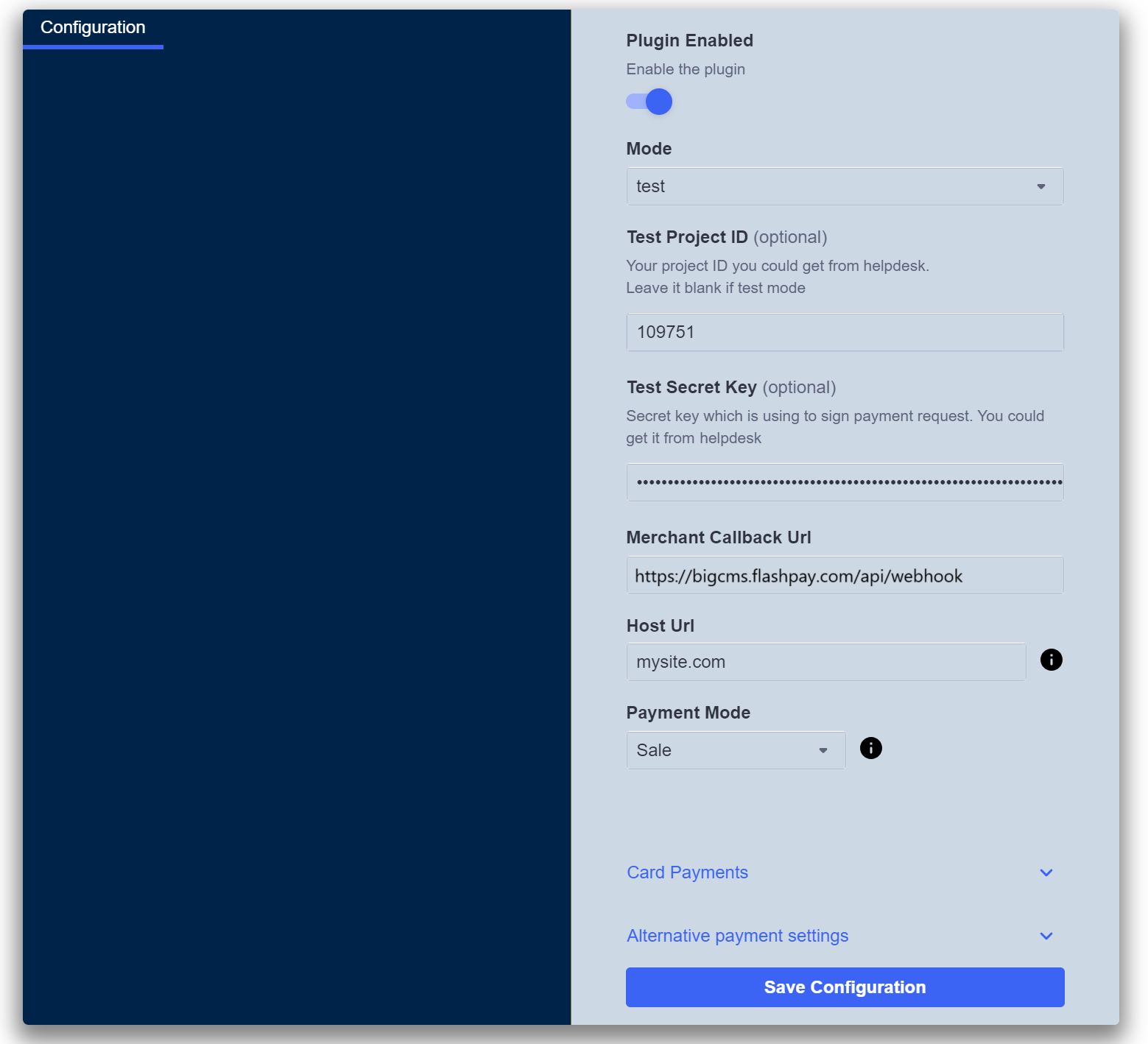 - Test Secret Key—the secret key for the test project (must be the one received from Flashpay).