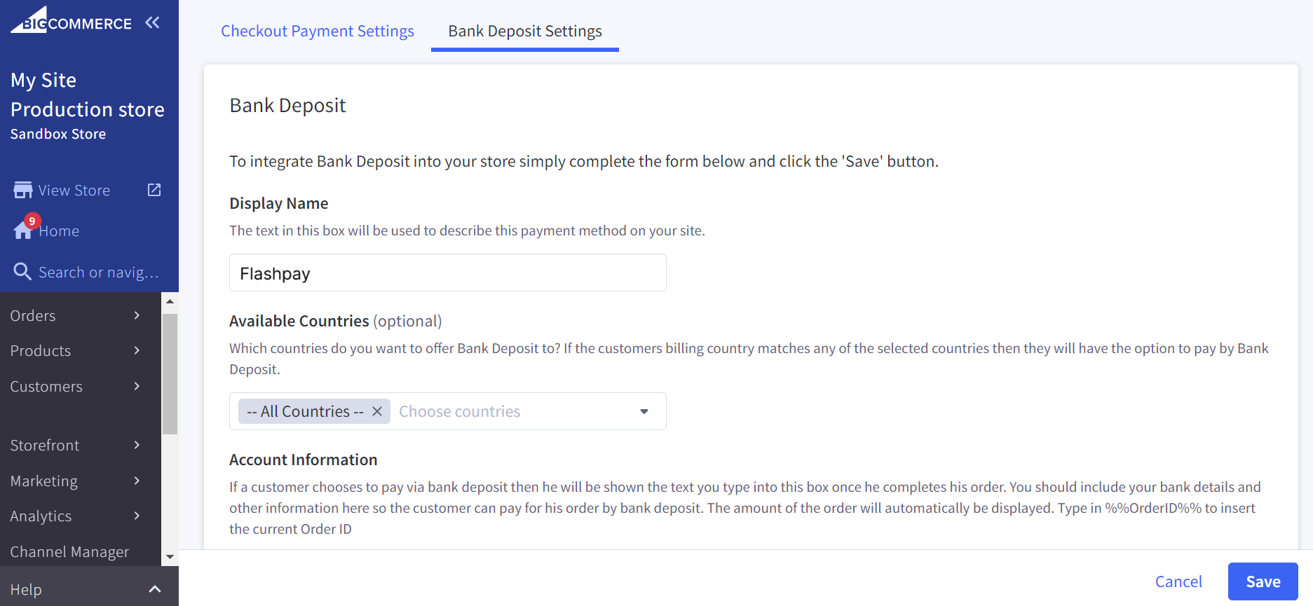 Flashpayin the Display Name field on the page that opens and save the changes by clicking the Save button.Figure 7. Page with parameters for using a payment option in the BigCommerce interface