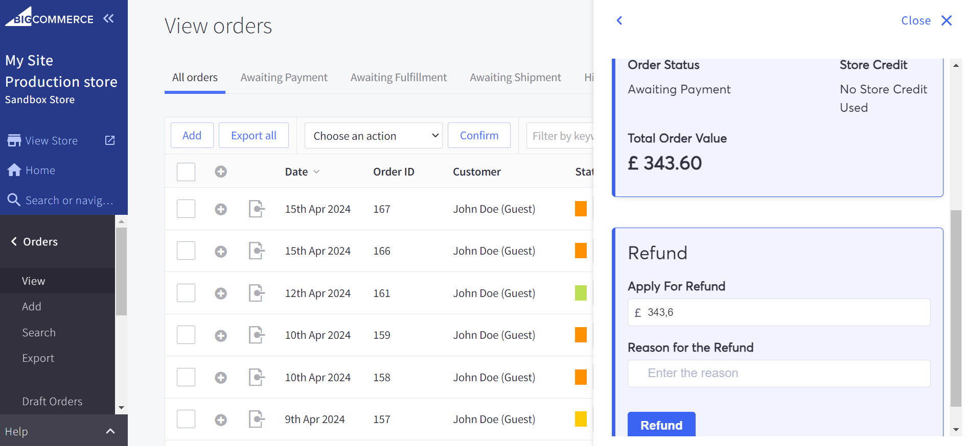 To issue a refund via the BigCommerce interface, proceed as follows: