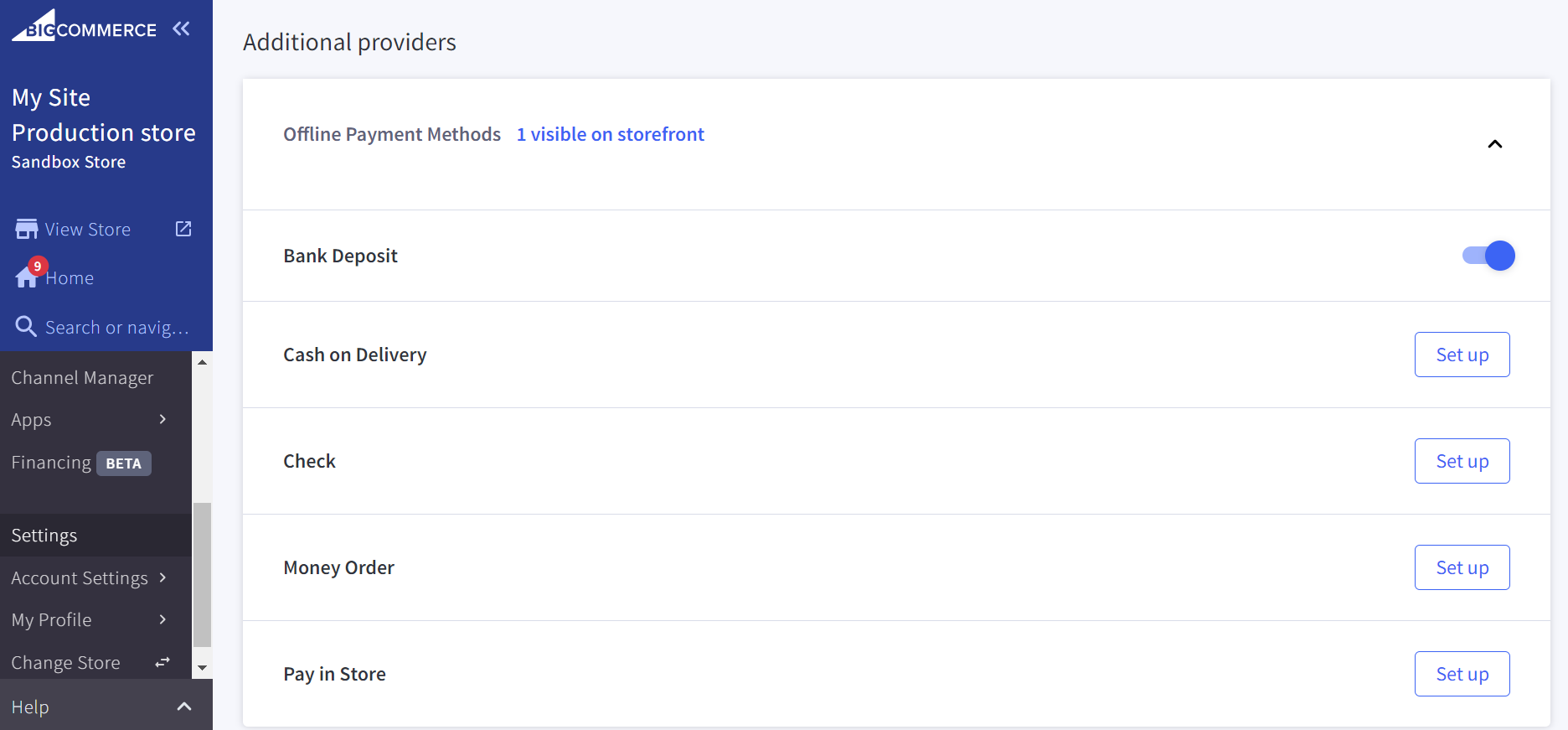 For this, open the Offline Payment Methods accordion item in the Additional providers section and click the Set up button in the line of the appropriate payment option (Bank Depositor another method).