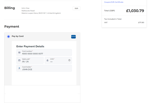 The first of these options is available is used by default. In case of the firstthis option, the customer specifies payment card credentials and confirms the order, which is generated in the BigCommerce platform, and the payment, which is generated in the Flashpay platform, directly on the checkout page of the web service (using the Place Order button).
