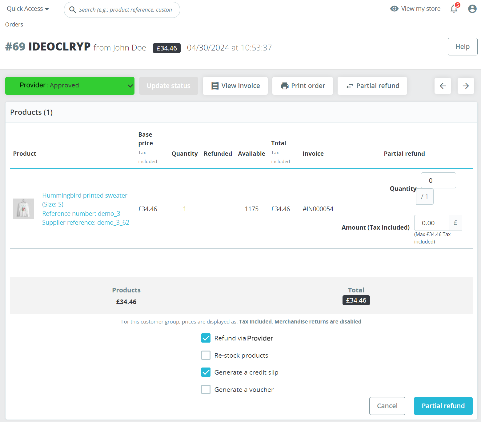 - Click the Partial refund button in the bottom right corner of the Products panel.
