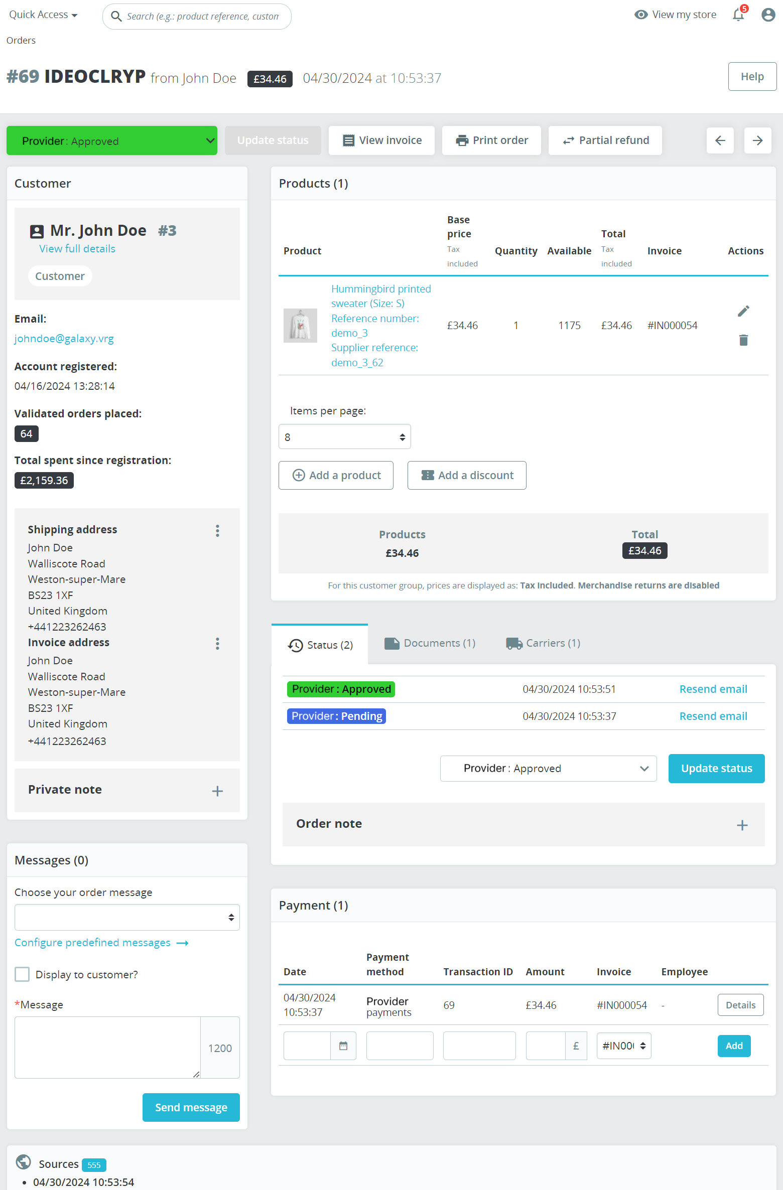For this, you can use the PrestaShop interface and, if relevant, the interfaces of the Flashpay payment form (the user interface Dashboard and the Gate API). Along with that, when using the interfaces of the Flashpay payment platform, order information in the PrestaShop interface is updated only if conditions for sending callbacks from the payment platform have been configured (details).