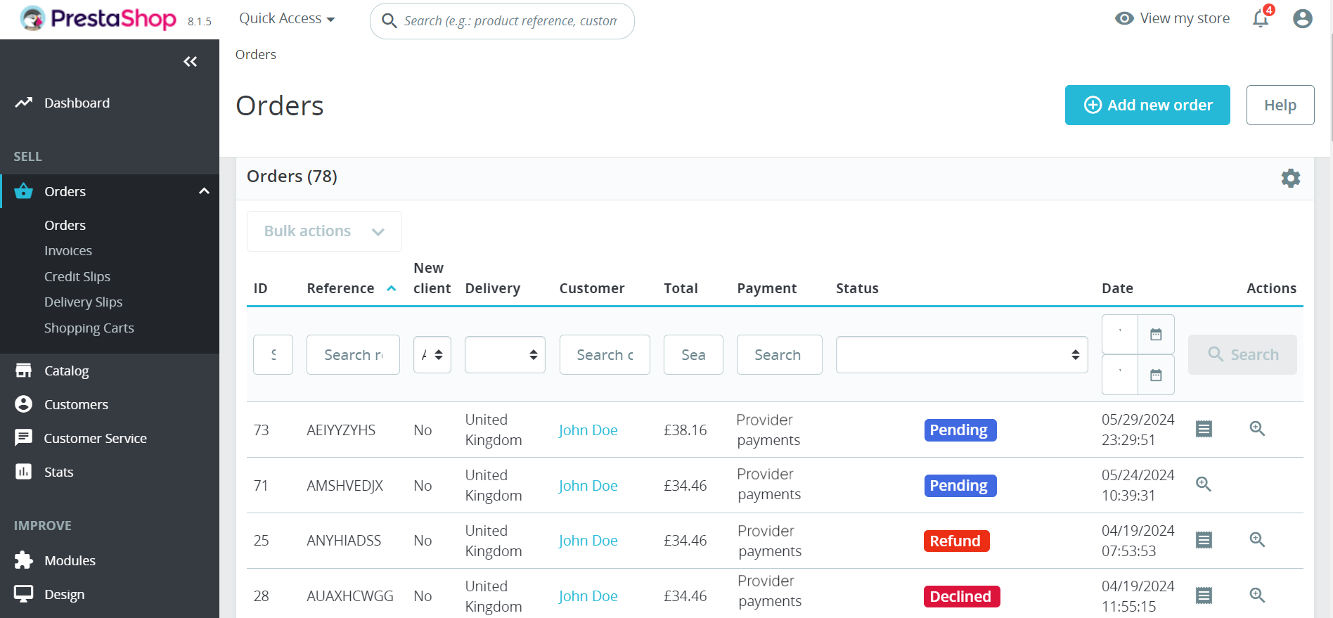 When testing the plug-in operation, you can process test purchases in the web service and obtain information about them via the PrestaShop, in the Orders subsection of the Orders section. Along with that, you can use special payment credentials that allow testing particular payment scenarios.