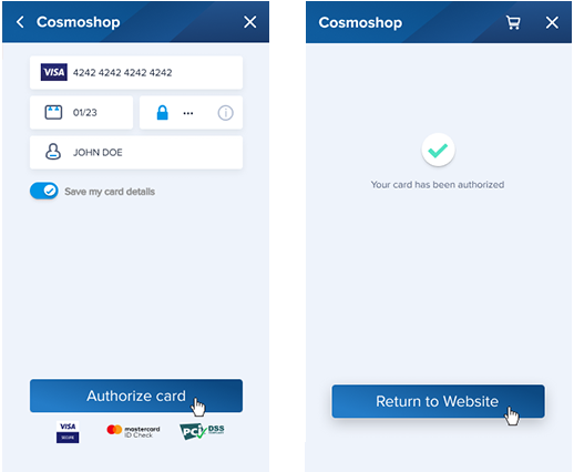 - 3‑D Secure authentication, in terms of which the customer is transferred to the service of the issuer where the customer needs to complete authentication using the code received by SMS or performing other required steps, or loading page is displayed (while issuer confirms authentication with no customer effort required).