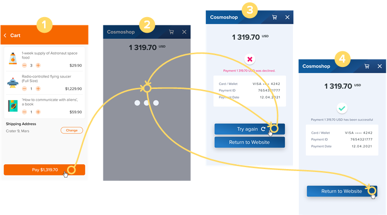 - After the purchase has failed, the final page of the payment form with the button for retrying the payment is displayed to the customer. Upon clicking the button, the customer is redirected to step 2.