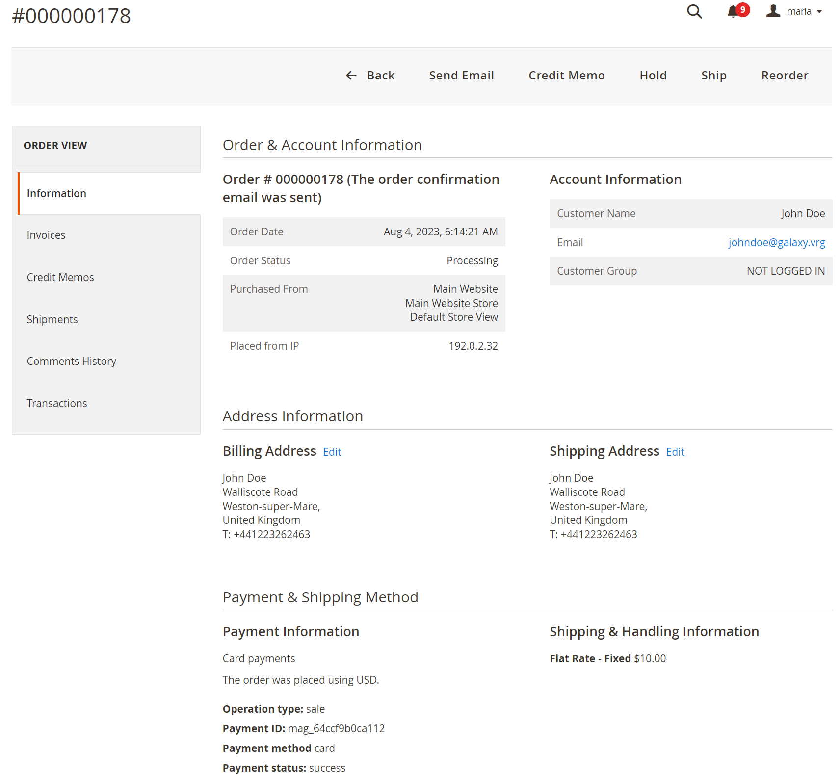 - Payment & Shipping Method — с базовыми сведениями о платеже и способе доставки;