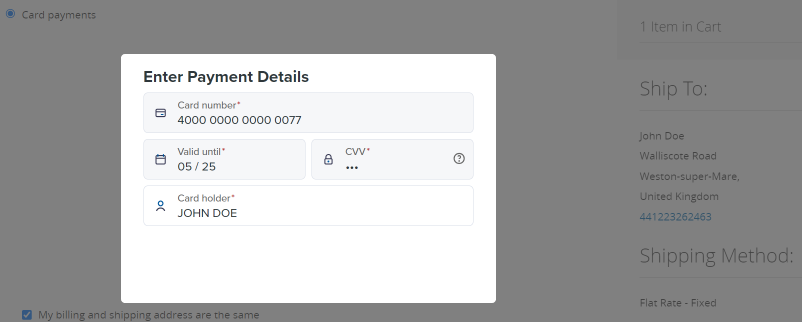 - Тестирование через тестовый режим работы плагина. Это вариант с локальным базовым тестированием работы платёжной формы и отдельных сценариев проведения карточных платежей, без подключения к платёжной платформе Flashpay. Он позволяет оперативно проверять работу платёжной формы и отдельные сценарии проведения карточных платежей. При этом в идентификаторах таких платежей, условно проводимых в таком варианте тестирования, используются кодовое слово