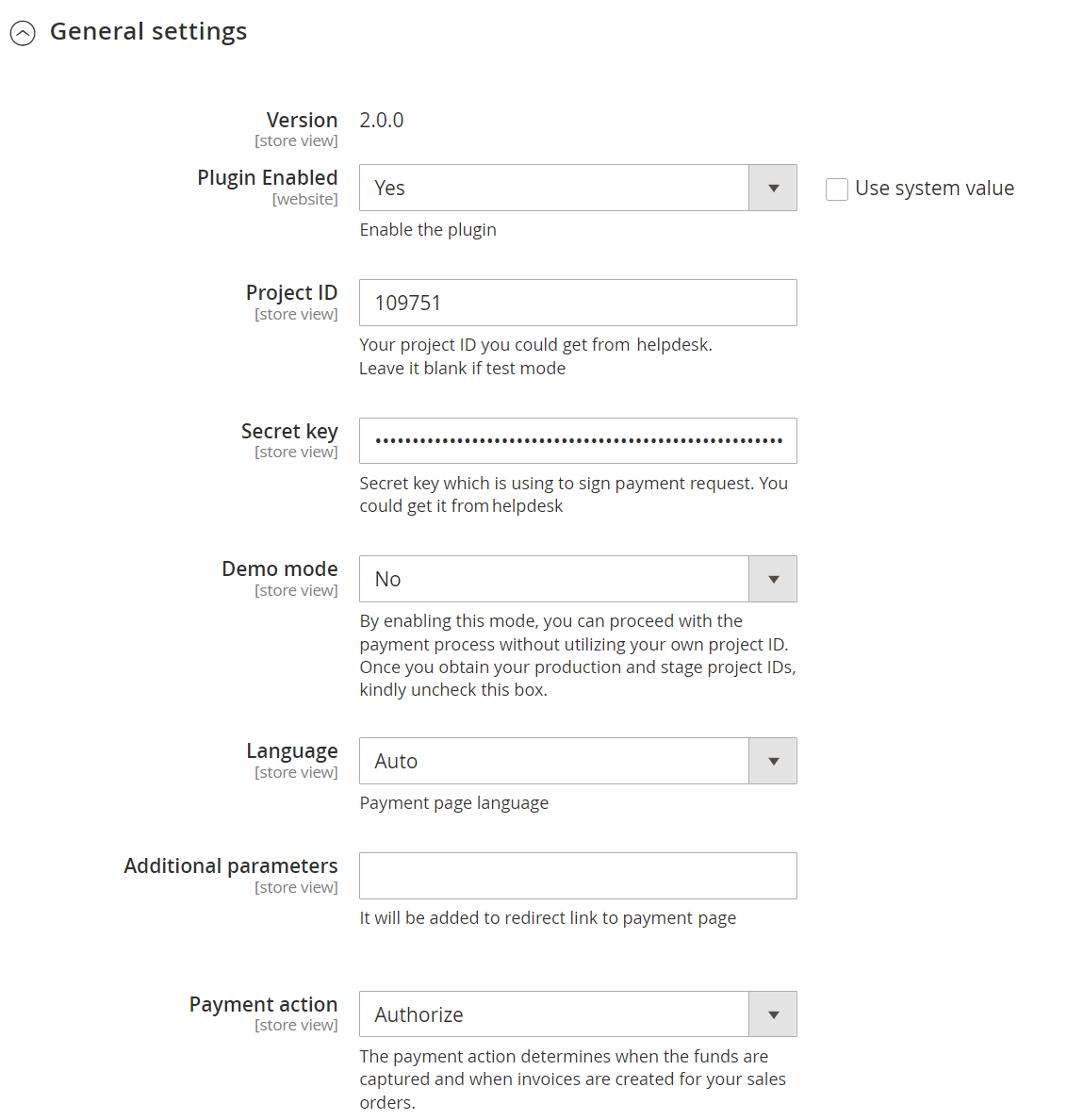 Прим.: При работе в тестовом режиме плагина значения, заданные в полях Project ID и Secret Key, игнорируются. Поэтому для использования тестового проекта в платёжной платформе Flashpay необходимо отключить тестовый режим плагина. - Project ID — идентификатор тестового проекта.;