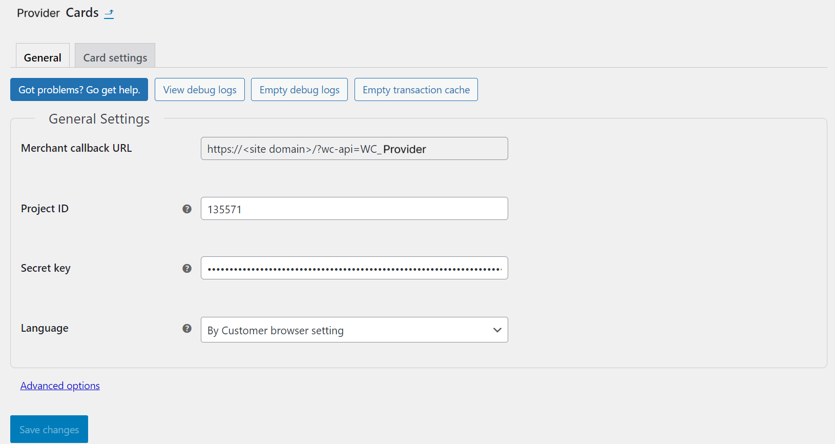 - Для используемого проекта настроена отправка оповещений от платёжной платформы к CMS WordPress, на URL, указанный в параметрах работы плагина в поле Merchant callback URL (в формате