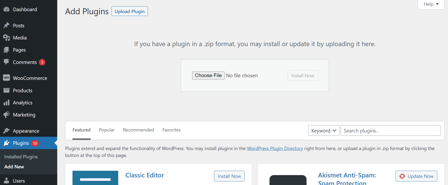 Для установки с помощью функции загрузки плагинов следует перейти в интерфейс WordPress и выполнить следующие действия: