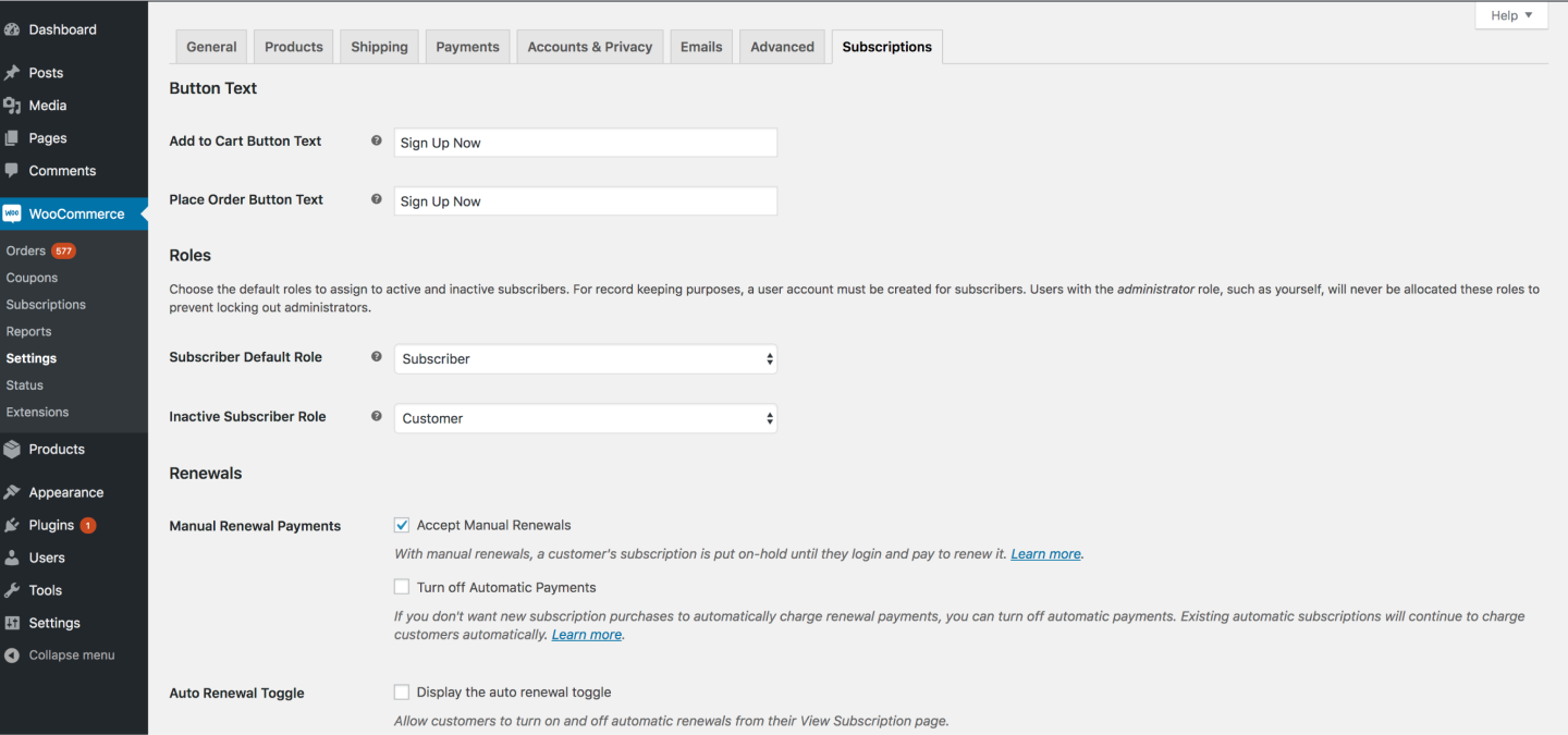 Более подробная информация о работе с повторяемыми оплатами в интерфейсе WordPress представлена в документации WooCommerce.