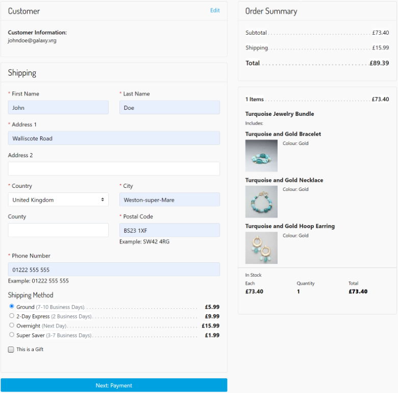 - На стороне веб-сервиса пользователь открывает страницу перехода к оплате, указывает необходимые данные для формирования заказа и переходит к выбору способов оплаты (с помощью кнопки Next: Payment).