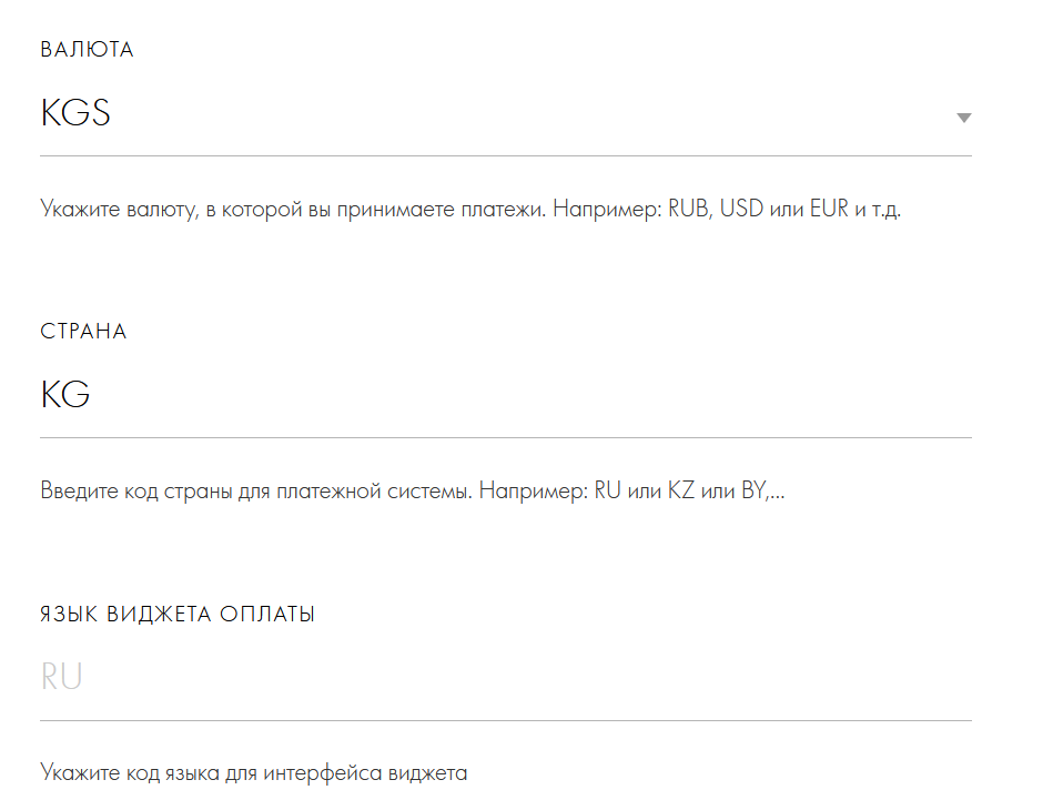 - Укажите в полях Валюта, Страна и Язык виджета оплаты соответственно основную валюту, страну и язык, на котором должна открываться платёжная форма.