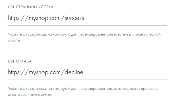 - Укажите URL-адрес страницы, на которую надо переадресовывать пользователя после успешной оплаты в поле URL страницы успеха. В поле URL отказа укажите URL-адрес страницы, на которую надо переадресовывать пользователя в случае отказа в выполнении оплаты.
