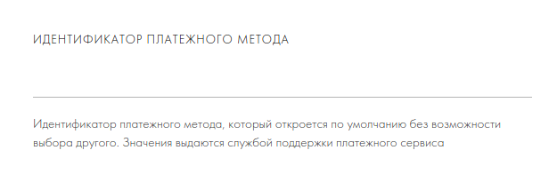 - Если нужно, чтобы платёжная форма всегда открывалась для оплаты с использованием определенного платёжного метода, в поле Идентификатор платежного метода укажите идентификатор этого метода. Перечень идентификаторов платёжных методов приведён в справочнике Коды платёжных методов.