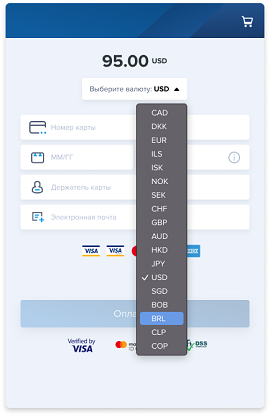 Этот вариант поддерживается только для классических карточных платежей, и при его использовании список доступных валют отображается пользователю только после указания номера карты.