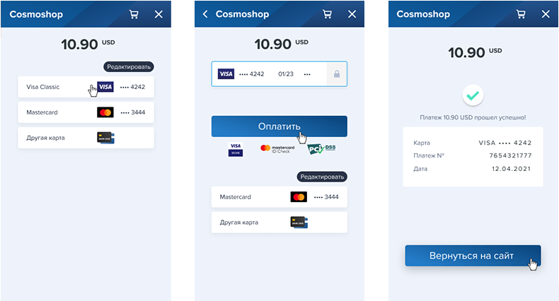 - Экспресс-оплаты. Списания в рамках таких оплат инициируются пользователем и выполняются без привязки к расписанию или сумме платежа. Например, пользователь онлайн-кинотеатра может оплатить прокат одного или нескольких фильмов с использованием сохранённых данных карты.