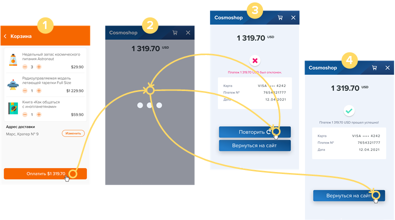 Со стороны пользователя проведение оплаты с выполнением повторных попыток выглядит следующим образом: